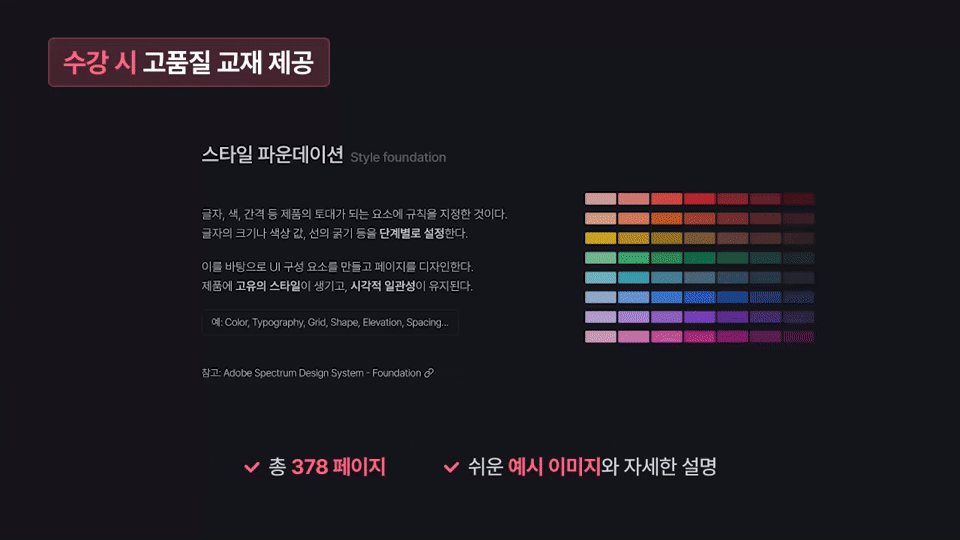 디자인 시스템이라는 거대한 개념을 "스타일 파운데이션"이라는 핵심 부분부터 배우기 때문에, 처음 접하는 사람도 부담 없이 시작할 수 있습니다.