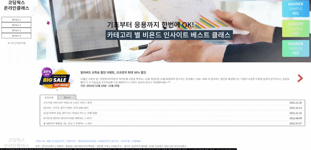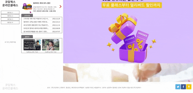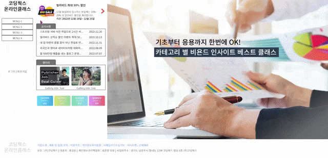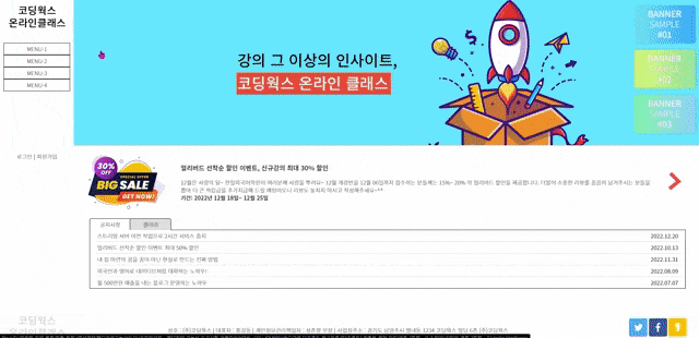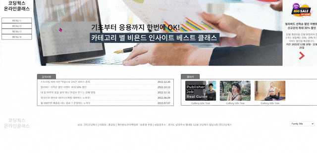 3. 그리고 공지사항 부분이요! 오른쪽에 선생님께서 ???ㅠㅠ 라고 하늘색으로 쓰신 부분 정말 공백이었어요!! 다만, 공지사항 부분에 엥? 하고 놀랬던 부분은, tab-inner 너비가 넓지 않을 수 있으니 공지 사항 부분에 em / b 태그를 이용해서 배치와 말 줄임을 공부하고 갔는데, 날짜 입력이 없었습니다! 그래서 편히 앵커만 넣고 블록 처리해서 중앙 배치해서 꾸몄습니다.