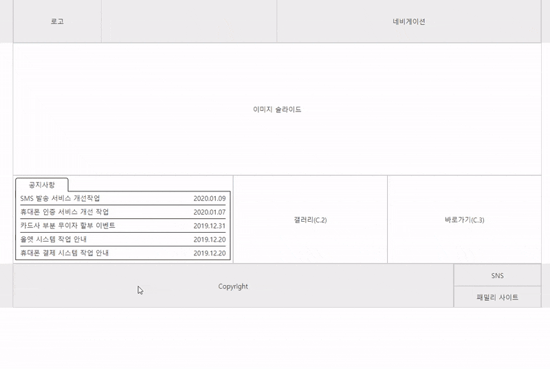선택 1) Flex 배치(전체 레이아웃) + Float, Position(레이어 팝업, 네비게이션, 공지사항) 선택 2) Float, Position(전체 레이아웃, 레이어 팝업, 네비게이션, 공지사항)