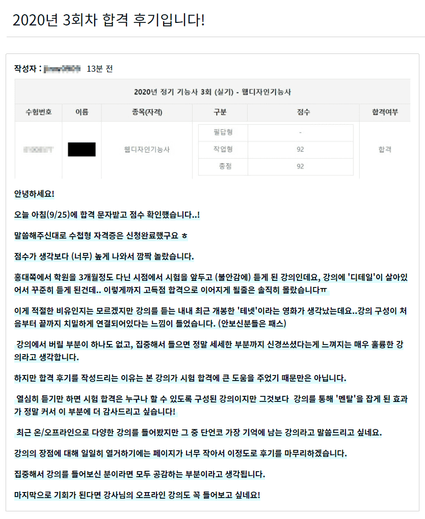 ▲ 인프런에서코딩웍스 웹디자인 기능사 실시 과정 학생이 합격했다고 올린 글입니다. 이럴 때 뿌듯합니다.~!!