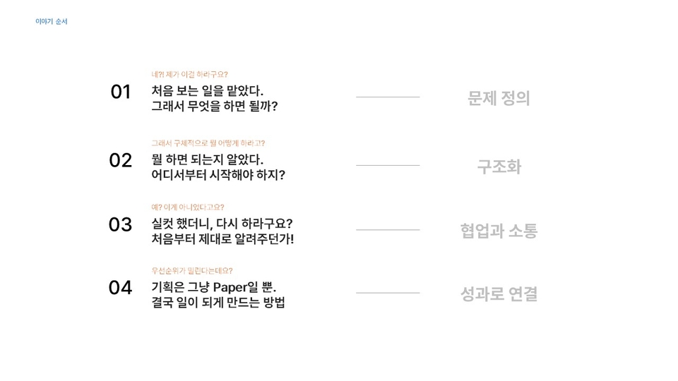 사수도 없고 가이드를 해줄 사람도 없을 때, 내가 이렇게 하는게 맞나 고민하면서 꾸역꾸역 문제를 해결하고 나면, "이게 아닌데?" 라는 청천벽력 같은 사람들의 피드백에 좌절합니다.