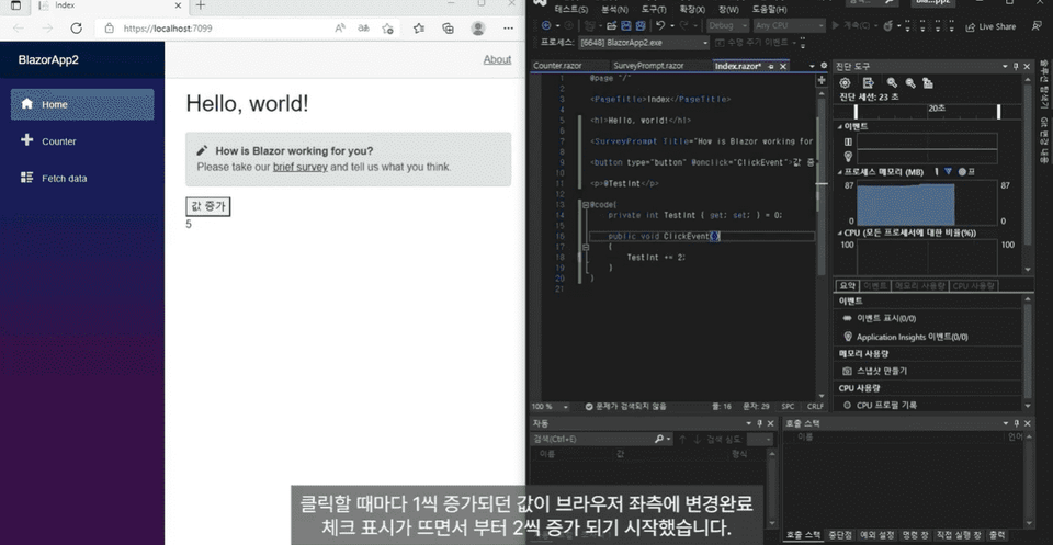 Blazor 페이지 안에서 변수 선언과 출력을 해보고, 실시간으로 변동되는 웹 페이지를 확인할 수 있습니다.