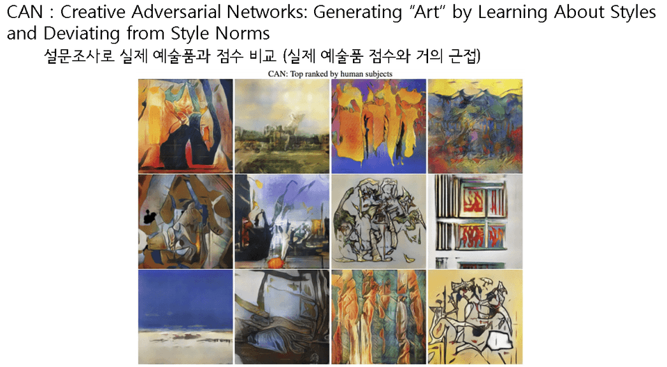 CAN모델은 GAN의 학습원리를 조금 바꿔서 예술품을 생성합니다. 인간에게 설문조사를 해서 실제 예술품과 비슷한 점수를 얻었다고 합니다.