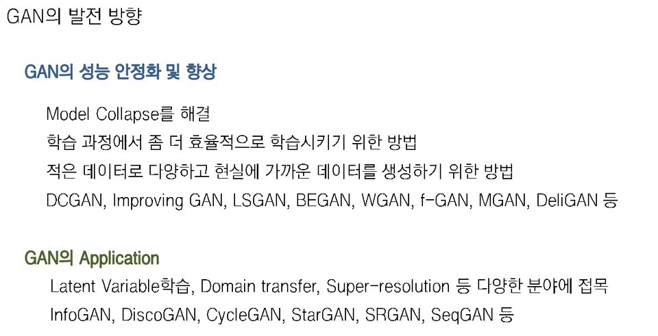 이미지가 아닌 머신러닝을 위한 정형 데이터를 생성하기 위한 Radial GAN, 학습데이터가 적은 상황에서 어떻게 하면 다양하고 고품질의 이미지를 생성해낼 수 있을까에 대한 모델인 DeliGAN, 여러개의 GAN의 모델을 조합한 MGAN, 저화질을 고화질로 바꿔주는 SRGAN 등 다양한 GAN에 대해서 간략하게 소개합니다.